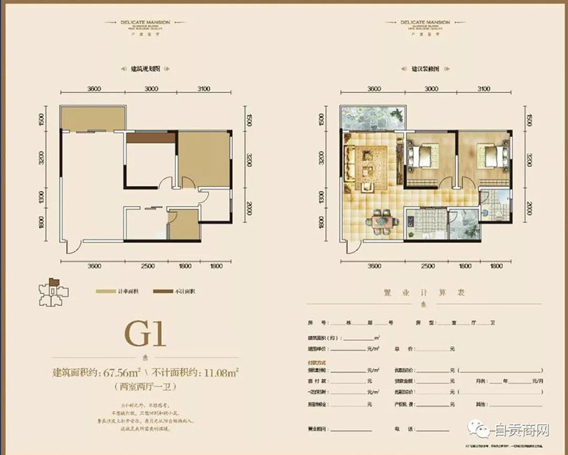 1、兩室兩廳:G1面積67.56㎡。