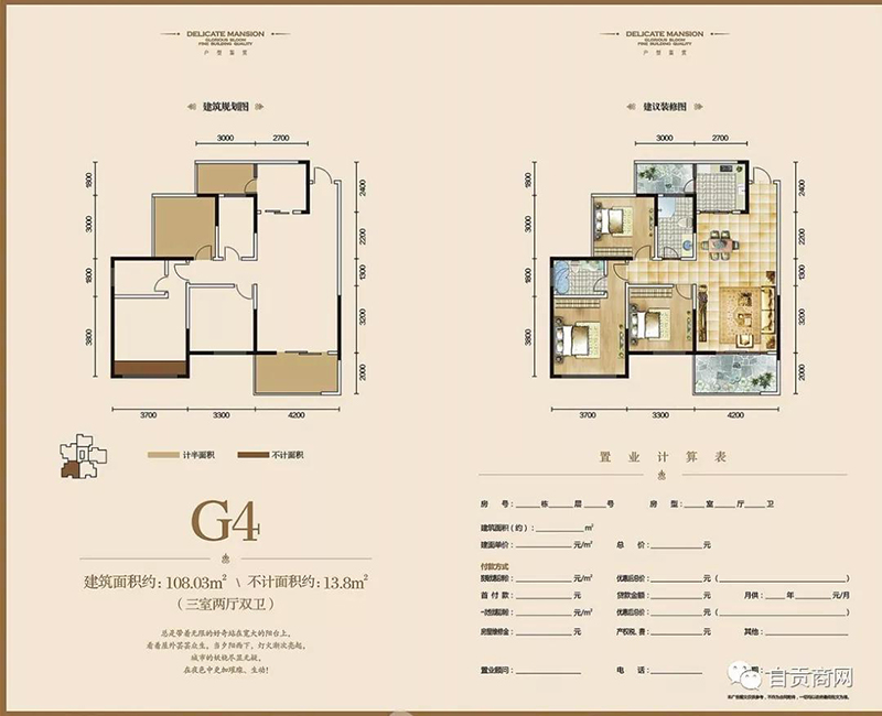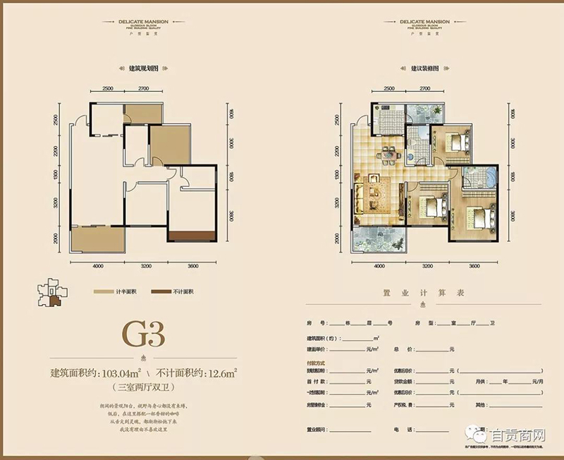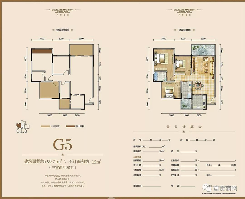 2、三室兩廳:G2面積86.12㎡。G3面積105.99㎡。G4面積110.76㎡。G5面積100.04㎡。