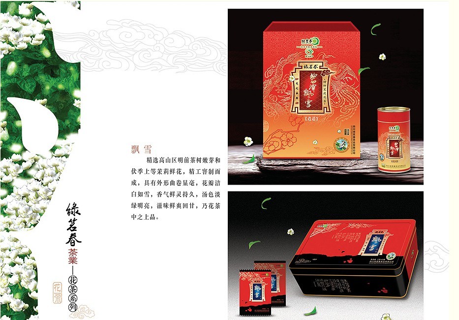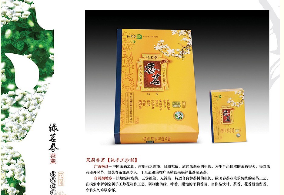 公司以四川農業大學、四川省茶科所等科研院所的技術、信息為依托,現已開發生產的 “綠茗春”牌生態綠茶系列產品主要有:巔峰之劍、雀舌、綠芽、綠針、綠毛峰、綠茗香、雨前春、玉露春、綠茶特級等;“綠茗春”牌茉莉花茶系列產品主要有:飄雪、花毛峰、茉莉香茗、濃香型茉莉特級、茉莉花茶特級、一級等。兩大系列產品十余品種近六十個包裝規格產品,該產品具有綠、香、醇、鮮之純天然特點,配以手工禮盒、鐵盒、復合袋等包裝形式,典雅美觀、盒形考究,是居家、茶樓、茶坊消費和饋贈親友之佳品。