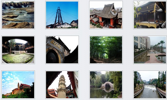 城區內現有200余座風格各異的明清、民國時期建筑,被專家稱之謂川南民居建筑藝術博物館;這里有史載開鑿最早古鹽井之一的大公井遺跡;有被譽為世界井礦鹽奇跡——高產穩產天然氣百年不衰的千米深井“東源井”;有現存天車最高、依然保持生產的鹵氣雙產的金流井;有重灘、艾葉、平橋、中橋和五皇洞等五座堰閘及鹽運碼頭等水、陸路古鹽道遺跡和遺存,構成了世界上最早的梯級運輸水利工程;有獨具各地方特色的南華宮、湖廣廟、貴州廟等數十座會社宗祠;有曾作為榮縣貢井分縣縣丞駐地的陳家祠堂;有依照紅樓夢大觀園建造的胡氏鹽商大宅;有清末所設的中國第一批郵政局遺址;有始建于唐代的佛教摩崖石刻——千佛巖;有難得一見的河中佛石——菩薩石;有吳玉章、謝奉琦、雷鐵崖等革命志士、歷史名人曾經求學的旭川書院;還有名震川南,峨眉朝山第一寺的古剎天池禪寺。