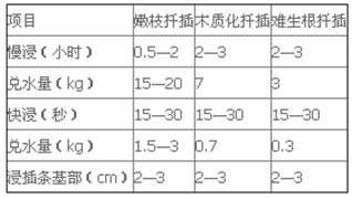 植物扦插育苗:用15克/袋生根粉沾根、浸根用法如表: