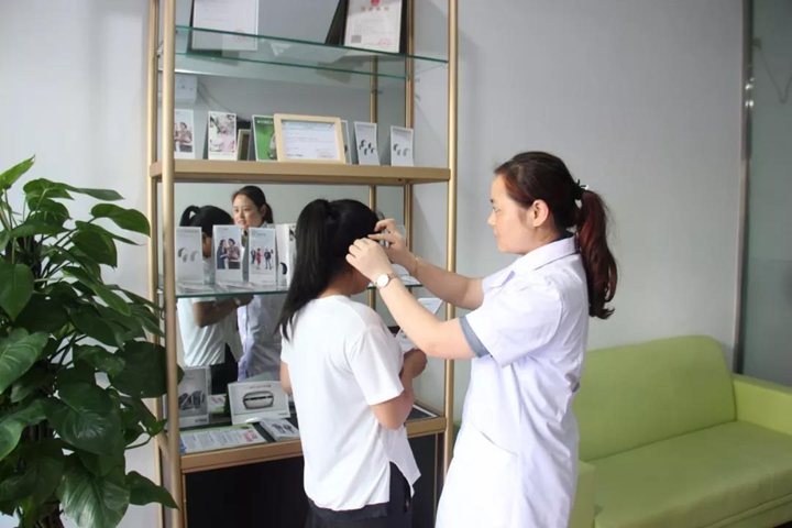 驗配師黃燕為客戶配助聽器