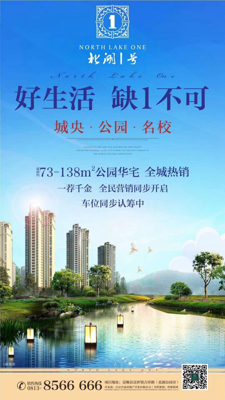北湖1號項目位于富順城北高端生活區,緊臨500畝北湖生態公園。是富順首席純住宅小區,項目占地118畝,由14棟電梯住宅和獨立商業樓組成,致力于打造城北人居生活典范。北湖1號項目是自貢合泰房地產開發有限公司開發傾力打造的生態智能人文社區。小區出入大門與500畝北湖生態公園無縫連接,一平方公里范圍有百年名校富順二中、縣人民醫院、世臻星級酒店、千盛超市近在咫尺。購物、休閑、娛樂、餐飲、教育、醫療等應有盡有,為業主提供快捷完善的生活服務。項目還配建獨立商業樓,打造集品牌旗艦店、幼兒園、大型農貿超市、康養服務中心、餐飲等多業態商業樓,滿足業主一站式的生活購物需求。