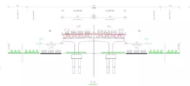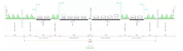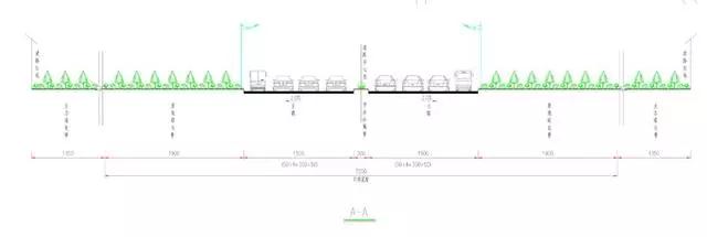 含有雙向機(jī)動(dòng)車(chē)、人行道和中央分隔帶:人行道7.0m、機(jī)動(dòng)車(chē)道20.25m、中央分隔帶3.5m