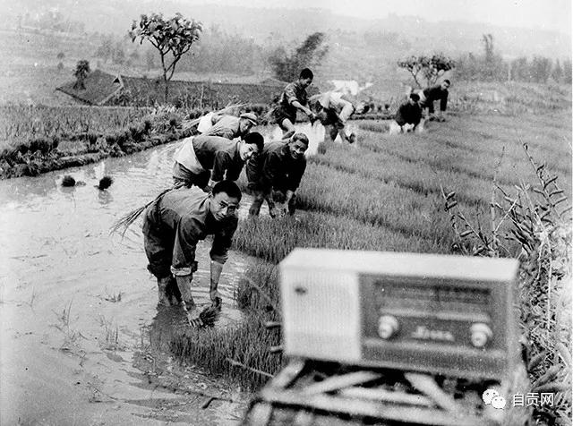 八十年代初半導(dǎo)體收音機進入農(nóng)村,富順縣寶慶公社人民二隊社員邊勞動邊拔秧頭(鄧佑云 攝)