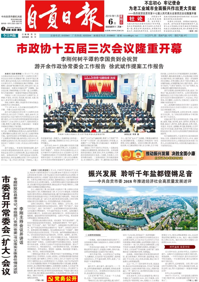2019年1月6日,自貢日報刊發重磅雄文《振興發展 聆聽千年鹽都鏗鏘足音——中共自貢市委2018年推進經濟社會高質量發展述評》。