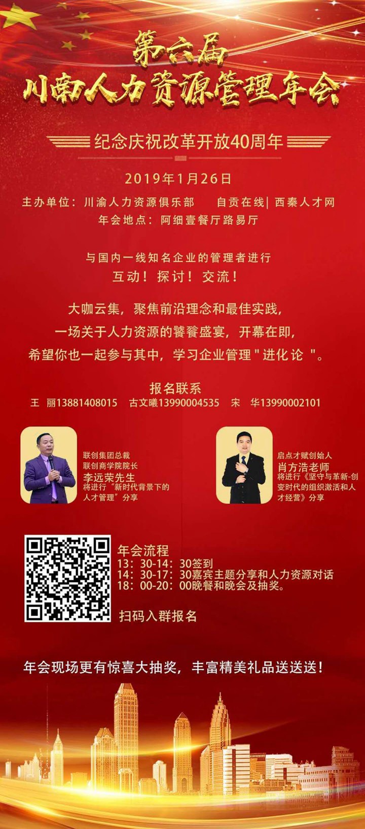 由川渝人力資源俱樂部和自貢在線(十大中文網站)聯合舉辦的第六屆川南人力資源管理年會即將于1月26日在自貢華商國際城阿細壹餐廳舉行。共同探新時代企業戰略和人才管理熱點背后的本質和規律,為企業的人力資源管理創新樹立標桿和典范!