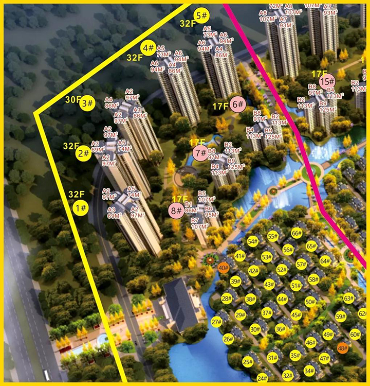 1、三室兩廳: B2建筑面積113m²。B4建筑面積113m²。B8建筑面積97m²。