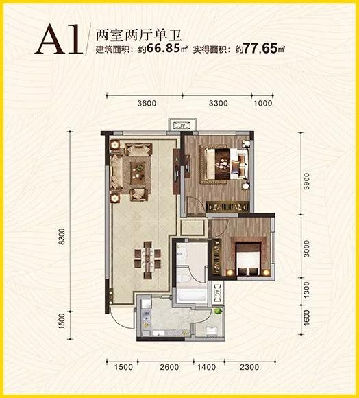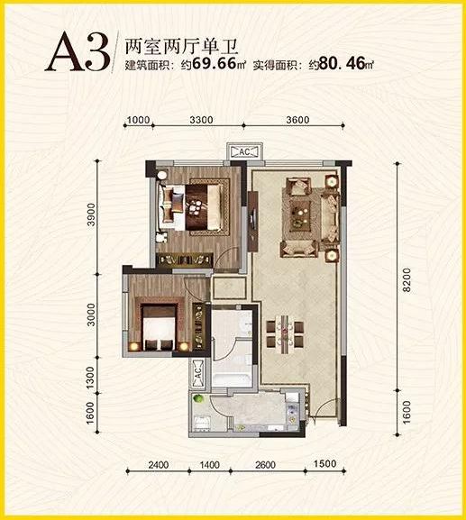 1、兩室兩廳:A3建筑面積69.66m² 。