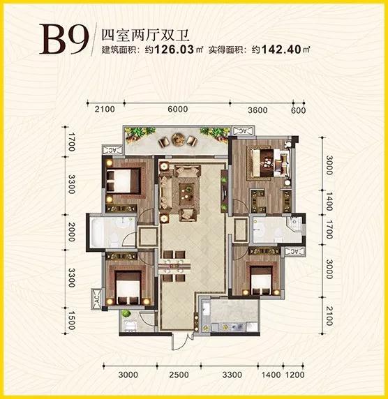 2、四室兩廳:B5建筑面積108.02m²。B7建筑面積107m²。