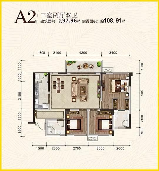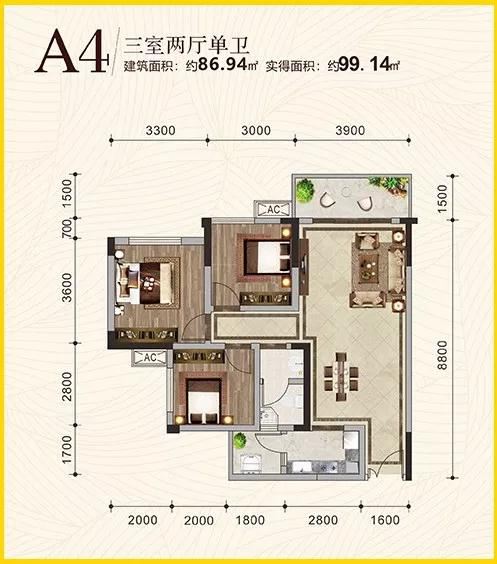 2、三室兩廳:A2建筑面積97.96m²。A4建筑面積86.91m²。