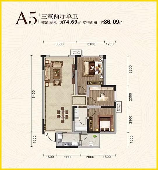 1、三室兩廳:A4建筑面積86.91m²。A5建筑面積74.69m²。 A6建筑面積94m²。