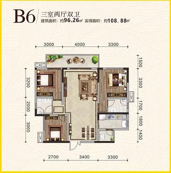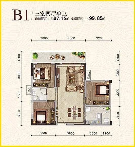 1、三室兩廳:B1建筑面積87.15m²。 B6建筑面積96.26m²。