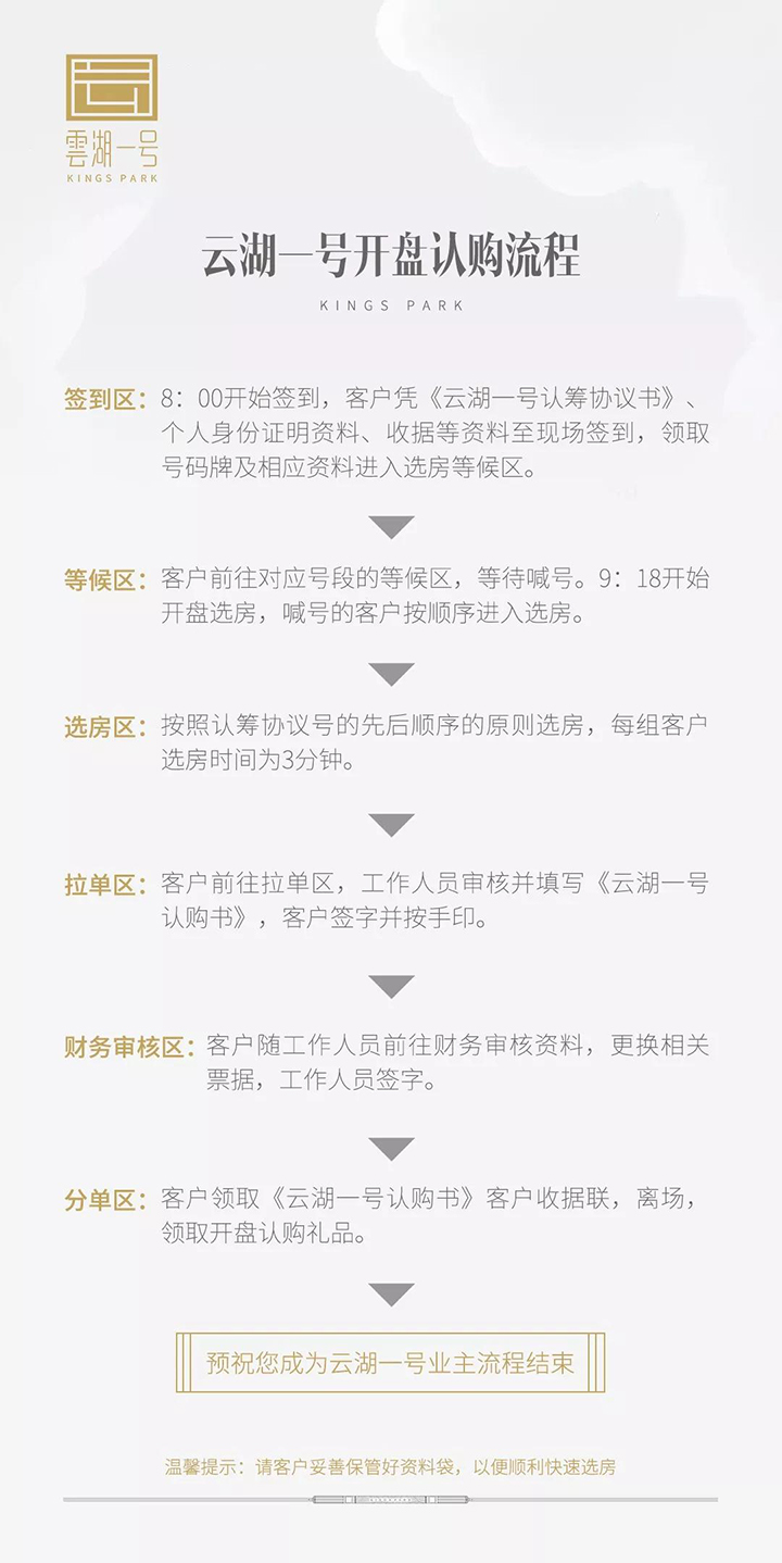 您好,為了方便您更安心、更便捷的參與云湖一號首批次盛大開盤活動,為了讓您能滿意的選購到心儀房源,現將此次開盤的事宜作如下溫馨提示: