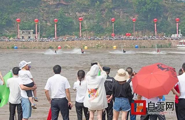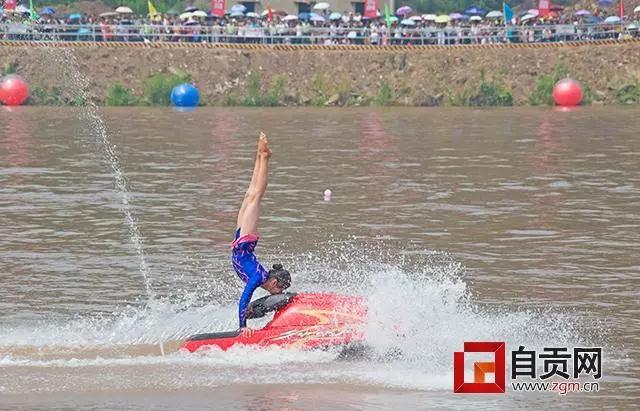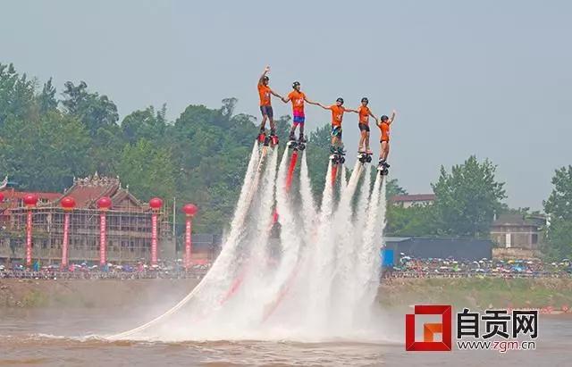 當(dāng)天,除了競(jìng)龍舟、搶鴨子等民俗活動(dòng)外,還舉行了精彩的文藝表演、水上表演。其中,最吸引眼球的是,來自中國國家特技滑水隊(duì)帶來的“水上飛行器”表演,5名“空人飛人”們將腳踏在5、6米高的水柱上在表演后空翻、鉆石等各種高難度的花式動(dòng)作,猶如“水上鋼鐵俠”一般,引發(fā)了全場(chǎng)歡呼。