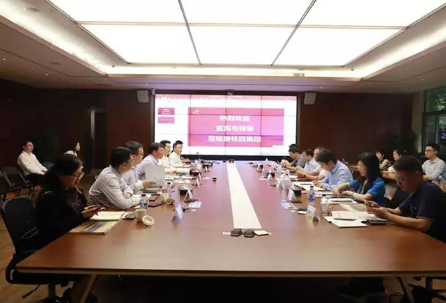 2019年7月8日,宜賓市委常委、統戰部部長李學焦、宜賓市經濟合作和外事局副局長王超、宜賓市經濟發展服務中心副主任竇宇航、宜賓市房地產管理局副局長袁永靜、宜賓市經濟合作和外事局廣東分局副局長孟明強一行到訪碧桂園集團總部考察交流并召開座談會。