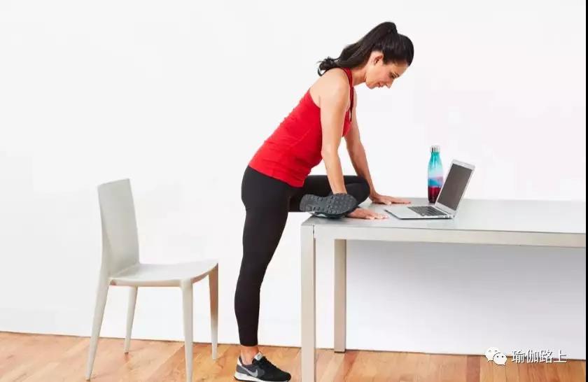 左腿放到桌上,并讓小腿盡量與桌沿平行