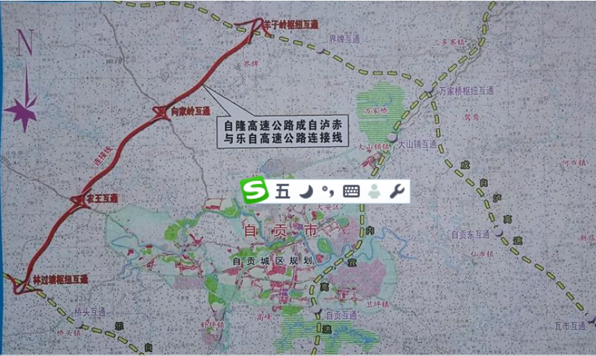 連接線示意圖自隆高速公路成自瀘赤與樂自高速公路連接線全長20公里,總投資20.5億元,起于內江市威遠縣界牌鎮,接成自瀘高速公路,在界牌鎮以西跨威遠河,與省道207、省道305交叉后,止于自貢貢井區橋頭鎮,接樂自高速公路,全線采用雙向四車道高速公路標準建設,設計時速80公里/小時。項目建成后,將與已建成的成自瀘高速、樂自高速和自隆高速構成自貢環城高速環線,完善自貢“四縱三橫一環”的高速公路路網體系。