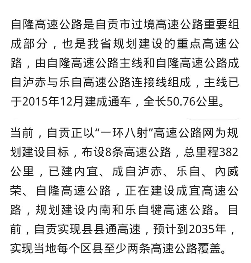 目前,自貢正以“一環八射”高速公路網為規劃建設目標,布設8條高速公路,總里程382公里,已建內宜、成自瀘赤、樂自 、內威榮、自隆高速公路,正在建設成宜高速公路,規劃建設內南和樂自犍高速公路。目前,自貢已實現縣縣通高速,預計到2035 年,實現當地每個區縣至少兩條高速公路覆蓋。
