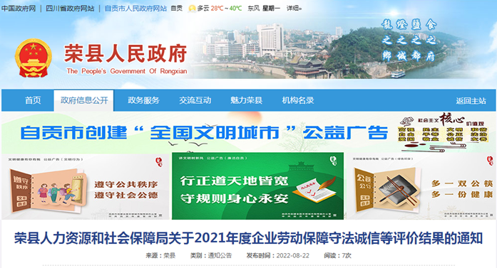 根據(jù)《企業(yè)勞動保障守法誠信等級評價辦法》(人社部規(guī)〔2016〕1號)《榮縣企業(yè)勞動保障守法誠信等級評價實施辦法》,結(jié)合勞動保障監(jiān)察日常巡視檢查、書面材料審查、隨機抽查、舉報投訴查處等情況對我縣規(guī)模以上企業(yè)2021年度勞動保障守法誠信等級進行綜合評定,現(xiàn)將評價結(jié)果及有關(guān)事項通知如下: